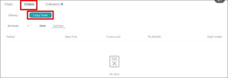 And if you check the “Copy Trade (Current Copy Trading Orders)” tab, it looks clean — there aren’t a series of open trades showing large unrealized losses.